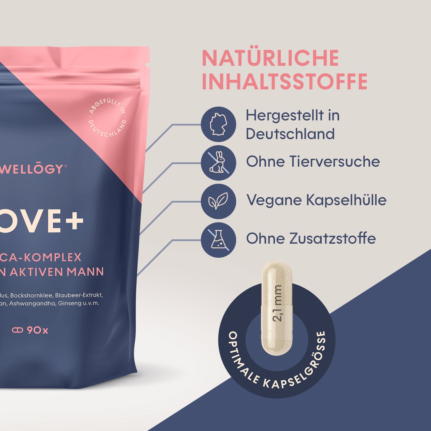 Kraft und Potenz spielen eine wesentliche Rolle für das persönliche Wohlbefinden und tragen zu einem aktiven Lebensgefühl bei. Entdecke mit LOVE+ von Wellogy die natürliche Unterstützung für Männer, die mehr vom Leben wollen. Unsere hochdosierte Formel kombiniert die besten Superfoods wie Maca, Tribulus terrestris, Safran und Ginseng mit essenziellen Mineralstoffen wie Zink und Selen. Diese unterstützen die Erhaltung eines normalen Testosteronspiegels, fördern die Spermienbildung und geben dir die Energie, die du für einen aktiven Alltag brauchst.
