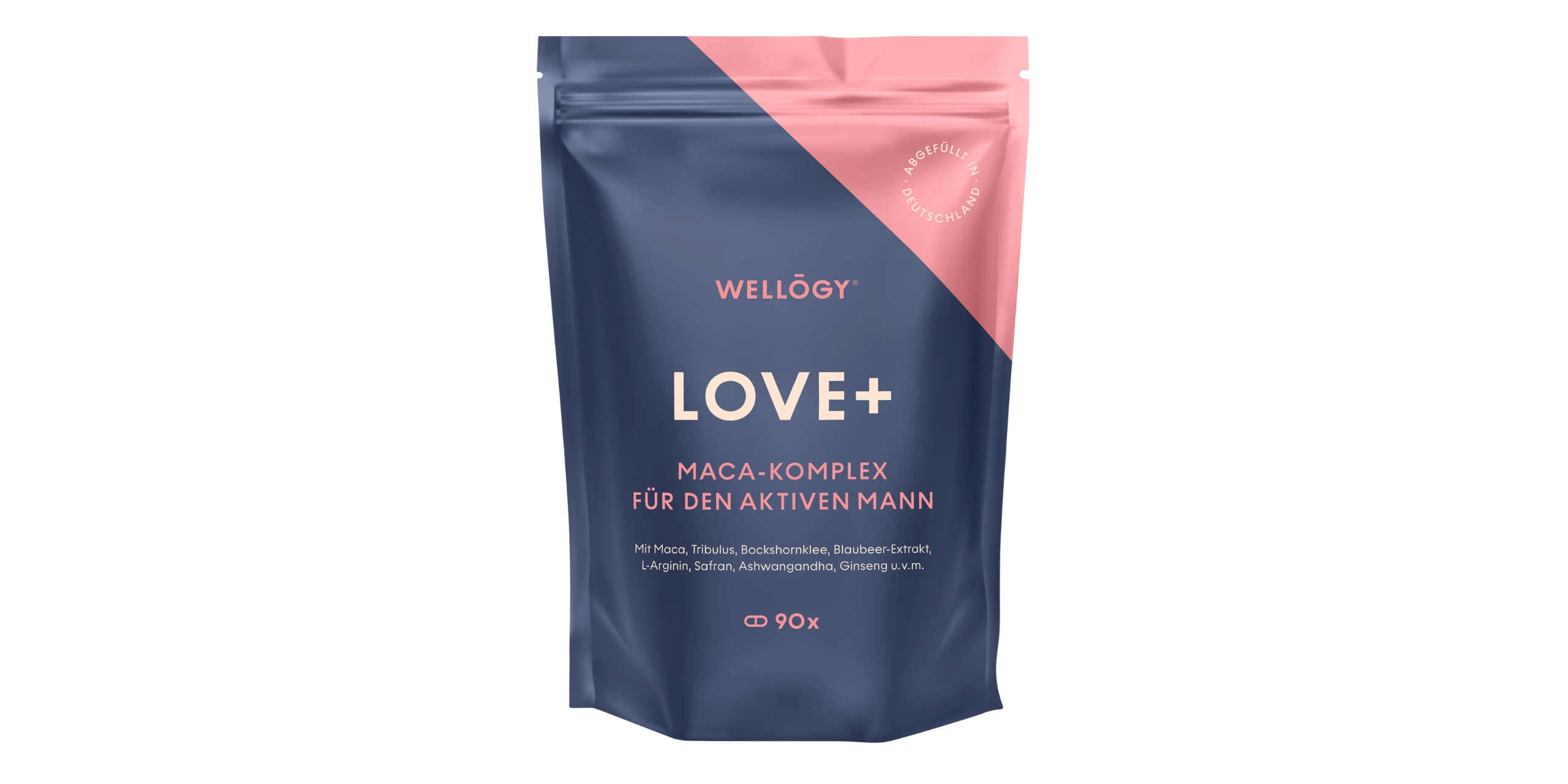 WELLŌGY Love+ vereint eine kraftvolle Kombination aus schwarzem Maca, L-Arginin, Zink und pflanzlicher Power aus Anthocyanidinen (Blaubeere), Safran und Ginseng.